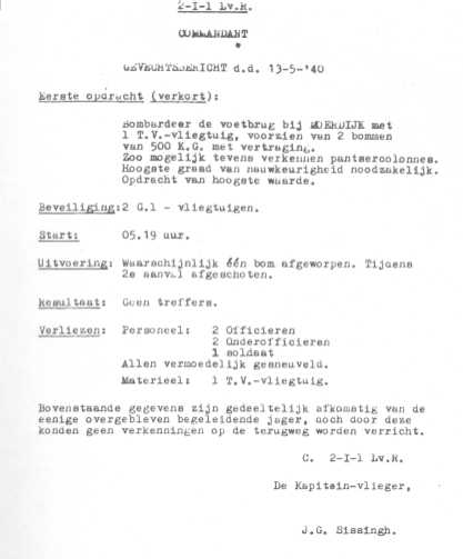 "Bombardeer met de grootst mogelijke nauwkeurigheid de verkeersbrug bij Moerdijk met mijnbommen van 300 kilogram met vertraging. Bescherming twee G1's, welke eventueel nog kunnen mitrailleren, doch niet ten koste van veiligheid T-V voor en tijdens bombardement. Het juiste treffen van de brug is thans van het grootste belang. Bemanning T-V en G1's moeten na deze actie z.m. tevens berichten of grote colonne's pantservoertuigen op of nabij de bruggen zijn waargenomen."