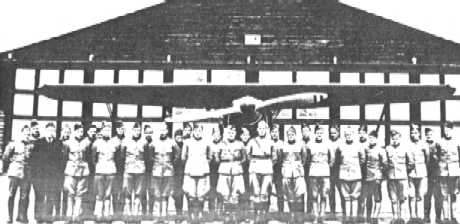 Bierema als langste (met laarzen) onder propeller van D-17 in april 1940 voor hangar vliegschool Soesterberg