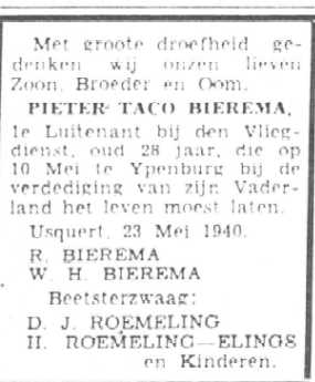 Rouwadvertentie Taco Bierema eind Mei 1940
