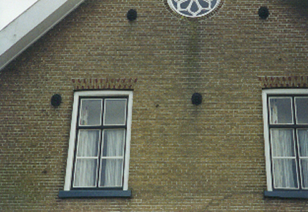 Foto van de voorgevel van een boerderij in Rijsoord. De drie kogelgaten van linksonder naar rechtsboven zijn duidelijk te zien. Ze zijn afkomstig van een aanval van een G-1. Waarschijnlijk werd bij deze aanval een Duitse colonne aangevallen door een niet nader te specificeren G-1.