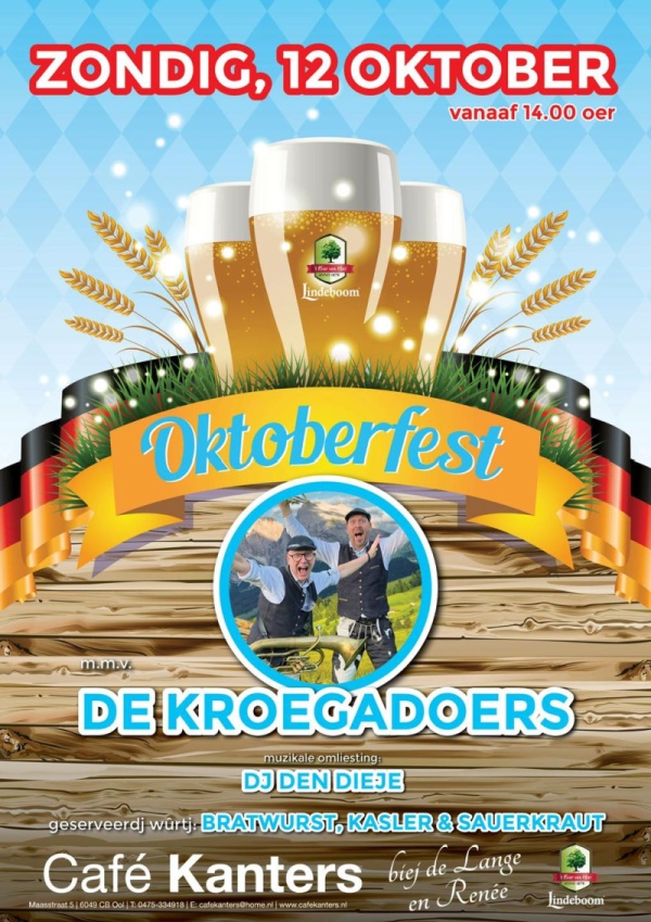 24-9-2025 - Zondag 12 oktober houdt café Kanters weer het jaarlijkse Oktoberfest, met dit jaar een optreden van "de Kroegadoers".