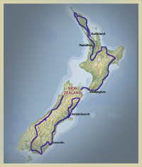 Vanuit Bangkok reizen wij door naar Nieuw Zeeland. Daar landen wij in de plaats Auckland. Het is de bedoeling om eerst het Noordereiland te doorkruisen om vervolgens bij Wellington over te steken naar het Zuidereiland. De route zoals getekend ligt nog niet vast maar dit is voorlopig ons idee. Vanaf Christchurch vliegen wij, na zes weken, weer terug richting Bangkok.