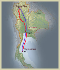Allereerst doen wij op de heenweg Thailand aan en bezoeken dan het noorden met als eindbestemming Chiang Mai (de blauwe lijn). Daar blijven wij 14 dagen.