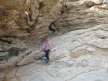 Foto links; In de rotsen zie je allerlei geslepen kleurrijke steenlagen. |