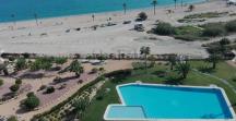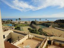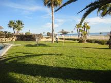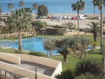 Foto links; Vanuit ons appartement kijken we over de tuin, zwembad, strand en Middellandse zee. |