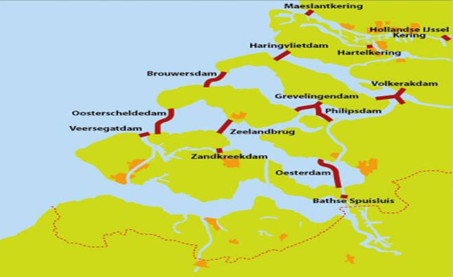 De Deltawerken is een systeem van 13 dammen die de provincie Zeeland moeten beschermen tegen overstromingen. Er is in totaal dertig jaar aan gewerkt.