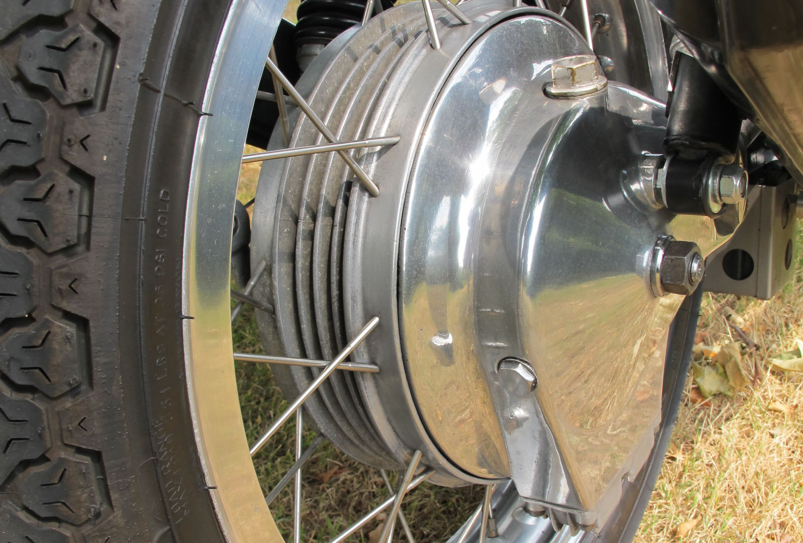 De originele Borrani spaakwielen zijn zo goed mogelijk hersteld. Hoewel de gebruikssporen te zien zijn heeft dit geen invloed op de rijeigenschappen.Zowel voor als achter zijn de wielen voorzien van hedendaagse banden (Heidenau) met een vintage profiel. De originele Brembo schijven geven voldoende remkracht.