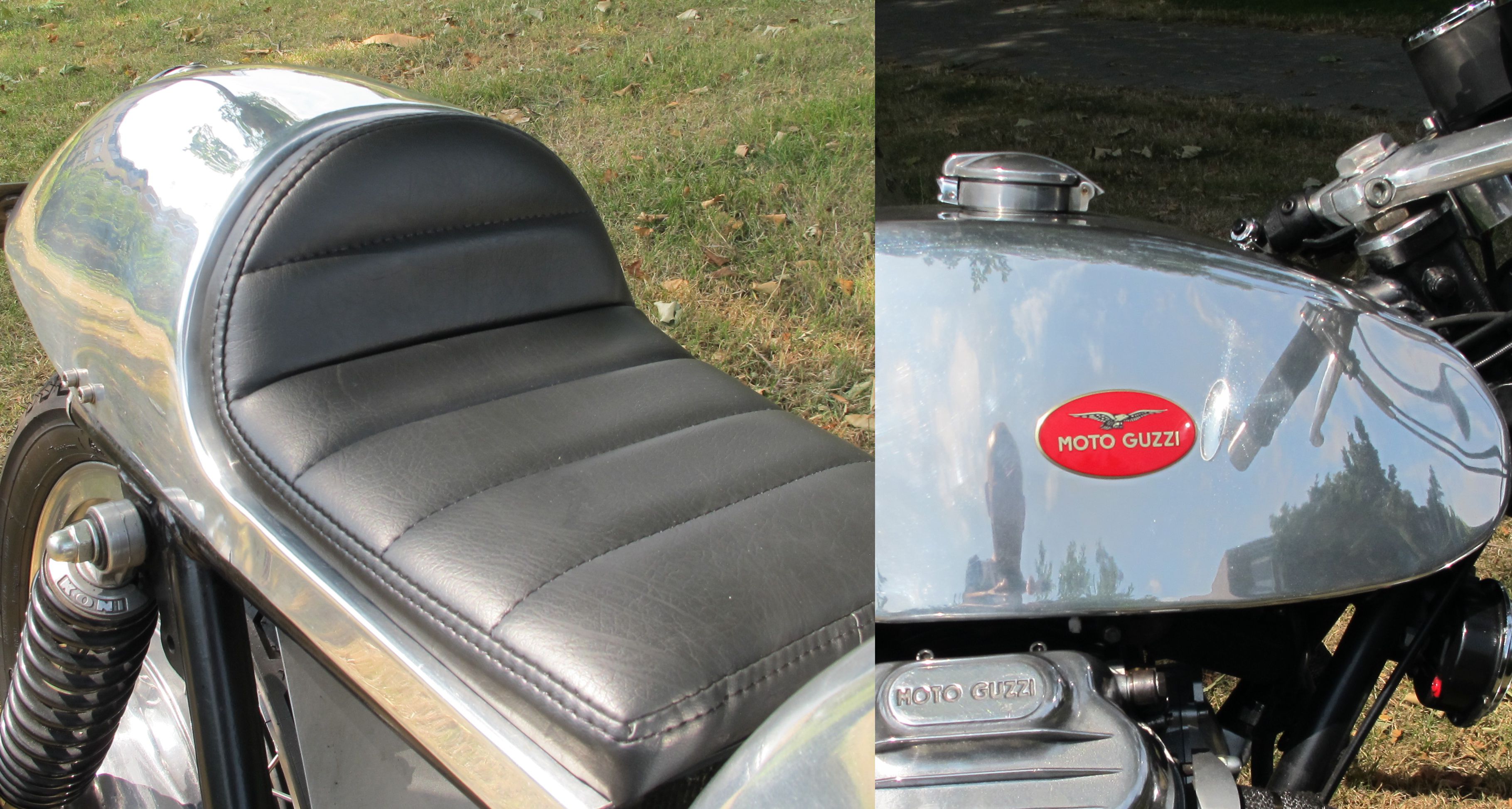Een handgeklopte aluminium tank met Monza vulopening. De tank is verlengd ten opzichte van de originele waardoor de lijn van de motor langer en slanker wordt. Het kontje is door dezelfde ambachtsman gemaakt. De enige vering in het zitgedeelte komt uit het stukje foam waar de rijder op zit. Toch levert dit een acceptabel zitcomfort op.