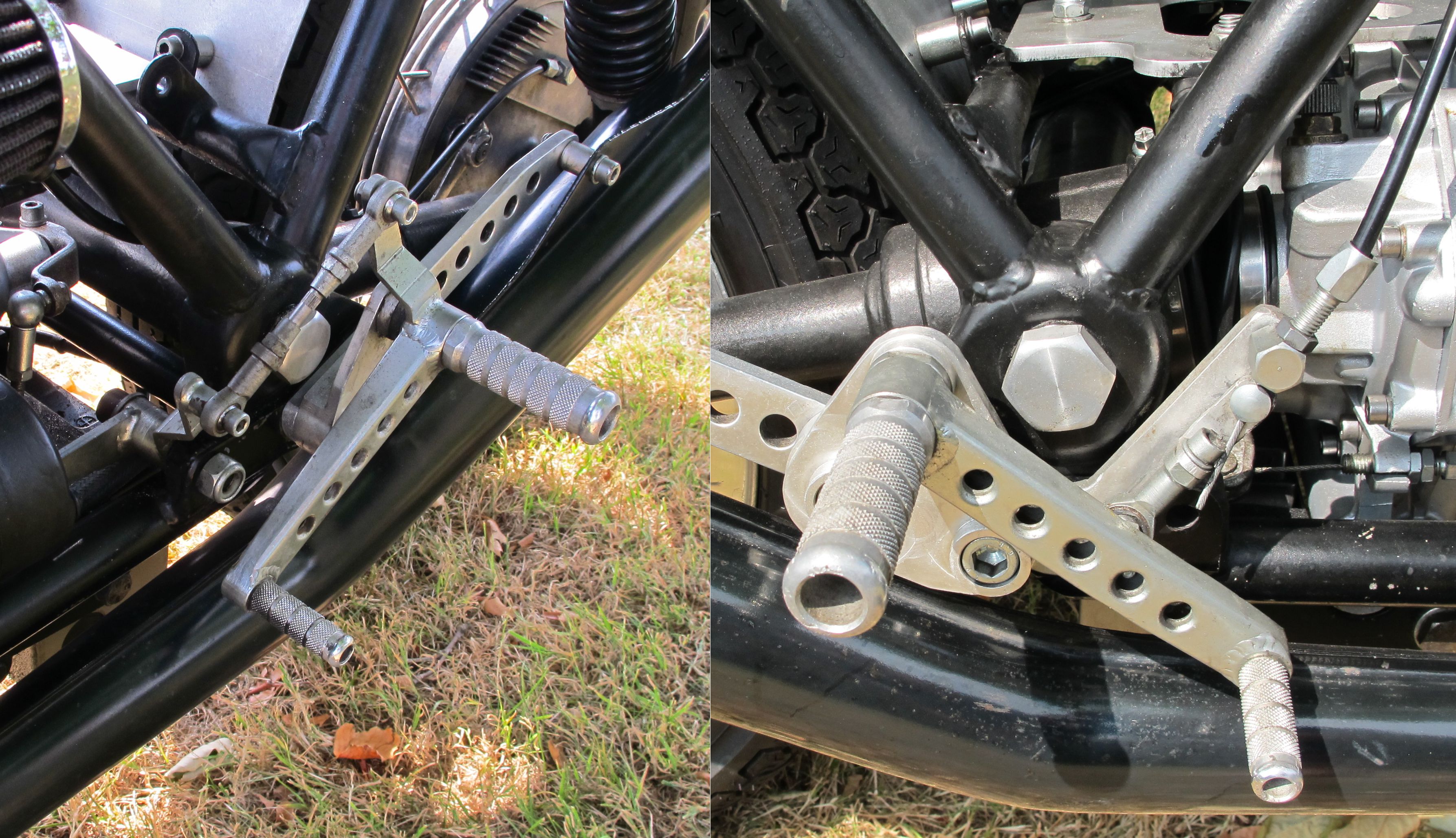 Motocicli Veloci rearset. Hiervoor zijn donor onderframepijpen gebruikt omdat de 850T afwijkt qua bediening. Ook is de voetrem dmv een kabel overgezet naar de remtrommel. Het schakelen is hiermee prettig direct. De voetrem doet wat je van een achterremtrommel mag verwachten: zeer weinig.