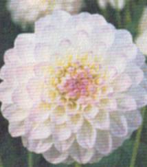 Kleinbloemig, een ietwat bolvormige vorm, wit met zacht lila-roze topjes, uniek in zijn klasse, pure snijdahlia.